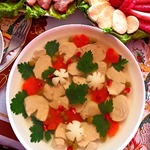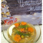 А теперь обязательно украсим, у нас же праздник. Из моркови, что варился бульон вырезать разные фигурки. Отварить перепелиные яйца и украсить, как видите на фото. Конечно же, вы можете украсить на свой вкус, тут полет фантазии. Это всегда будет красиво. Приятного аппетита! С Наступающим Новым годом! Пусть он принесет вам и вашим родным крепкого здоровья и много счастья!!!
