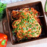 • Утром вынула грудку. Взяла глиняную форму. Лук с чесноком и остатками маринада выложила на низ формы, сверху-грудку. Поставила в духовку на 40 минут, выставив температуру 180 С. Через 30 минут я попробовала грудку на готовность, проколов её вилкой. Грудка выделила много сока + ещё майонез и томатный соус. Лук с чесноком в этом соке томился. Такой аромат. В принципе грудка уже была готова, но я её подержала ещё 10 минут. Ориентируйтесь на свою духовку, не пересушите грудку.