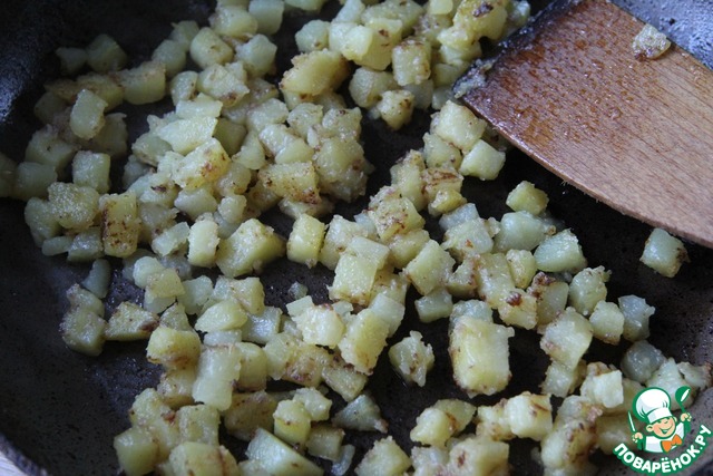 Отварной картофель нарезать кубиками, посолить и обжарить на растительном масле.