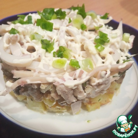 Этот рецепт я записывала очень давно, когда кальмаров можно было найти только в банках и крайне редко, если повезет. И вот, сейчас, когда идут предновогодние приготовления, захотелось чего-то иного, помимо Оливье. Решила заглянуть в свои старые "кладовые", нашла этот рецепт и, спустя много лет, приготовила салат, который, наверняка, был переписан из какого-то журнала тех времен, типа "Работница" или "Крестьянка". А салат, скажу я вам, очень вкусный! Достойный праздничного стола. Мы всей семьей решили, что он, вполне, заменит и Оливье, и Крабовый. Если и вы ищите вкусовых перемен, то попробуйте этот вариант. Приводимое количество продуктов ориентировочное. Готовлю все по вкусу, да и размеры заготовок у всех разные.