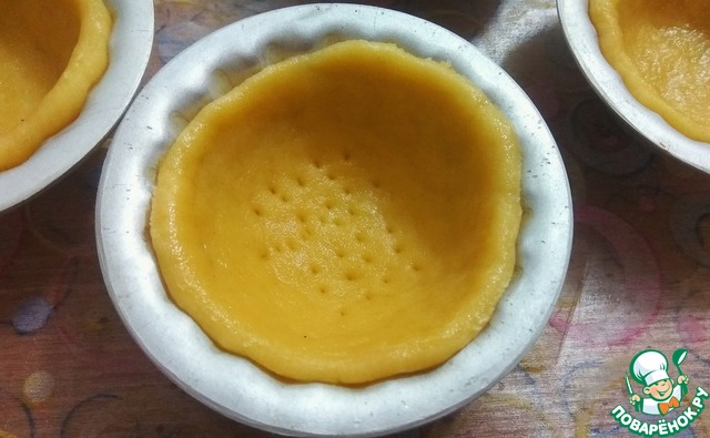 Выложить круги в формы для кексов. Дно наколоть вилкой. Бортики теста плотно прижать к стенкам формочек.