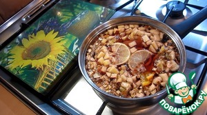 Добавляем смесь для глинтвейна, яблоки, апельсины и дольки лимона. Накрываем крышкой и варим еще 15 минут.