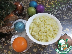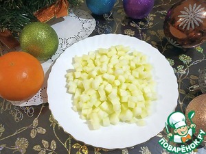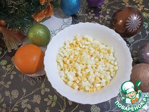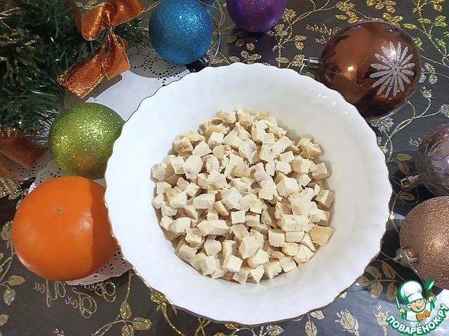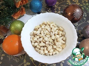 Филе индейки отвариваем в подсоленной воде (можно использовать любимые специи, но очень осторожно, чтобы не перебить вкус мяса). Остужаем и нарезаем маленькими кубиками.
