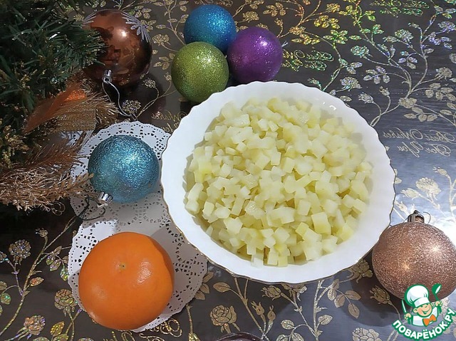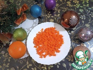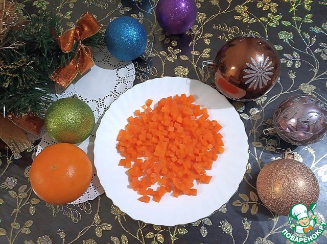 Варёную и охлаждённую морковь нарезаем маленькими кубиками. Промываем горошек.