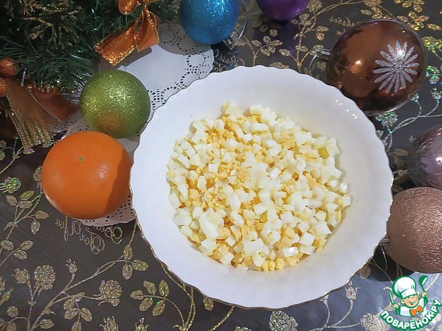 Варёные и охлаждённые яйца нарезаем маленькими кубиками.