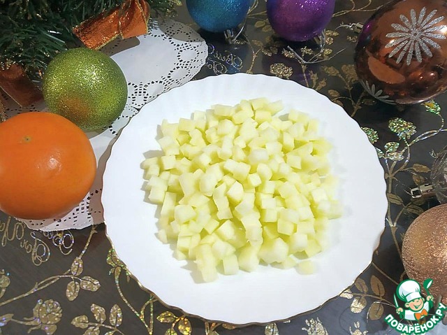 В последнюю очередь нарезаем маленькими кубиками очищенные яблоки. Сразу смешиваем все продукты, солим, перчим и заправляем майонезом.