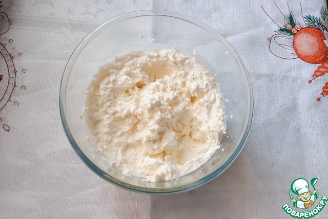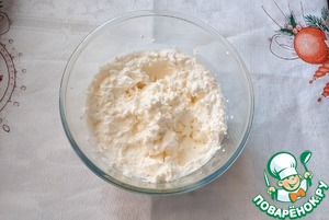 Для крема творог перетираем. Добавляем сахар и сливки. Взбиваем до загустения.