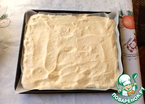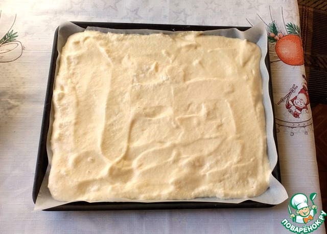 Противень (у меня 24*28 см) застилаем бумагой для выпечки. У меня проверенная бумага, и я её ничем не смазываю. Выливаем тесто на противень, разравниваем.