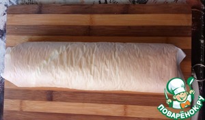 Горячий бисквит на бумаге снимаем с противня и сворачиваем в неплотный рулет вдоль длинного края.