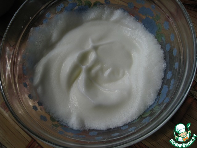 Для теста яйца разделяем на желтки и белки. Белки взбиваем с щепоткой соли до пены, добавляем лимонный сок и взбиваем до стойких пиков.