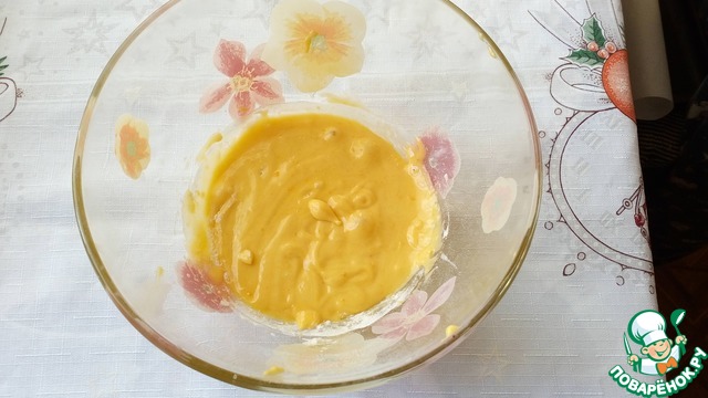 Пшеничную муку в\с смешиваем с крахмалом и разрыхлителем), просеиваем в миску с желтками. Перемешиваем лопаткой или миксером на самых маленьких оборотах. -