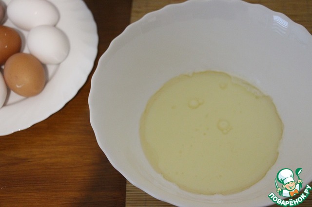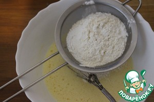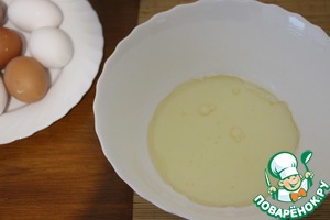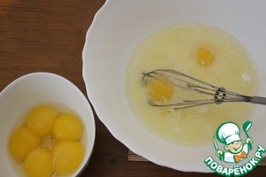Куриные яйца разделяем на белки и желтки. По одному вмешиваем яичные желтки в смесь молока и масла.