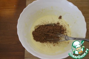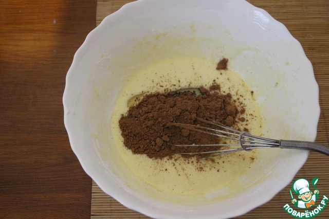 В одну часть теста вливаем отдельно взвешенные 10 г растительного масла и просеиваем какао-порошок. Всё хорошо размешиваем. -