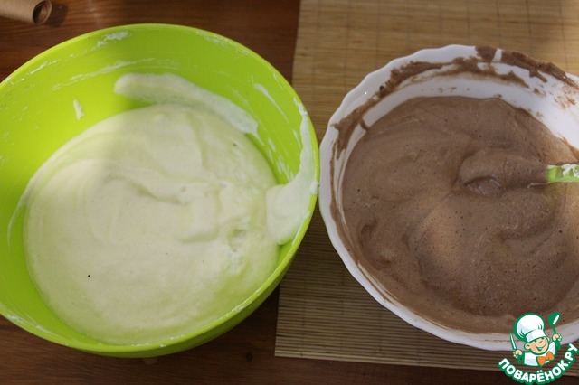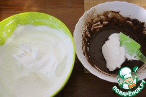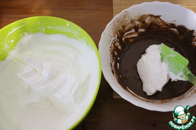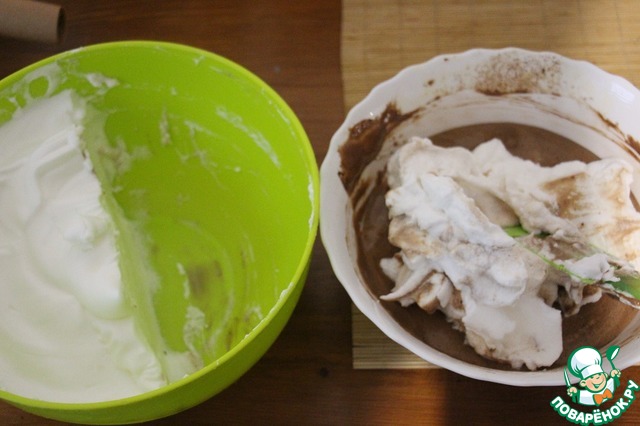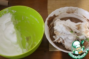 Яичные белки взбиваем до устойчивых пиков. Половину взбитых белков мы вводим в темное тесто.