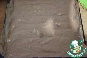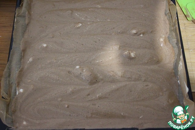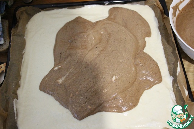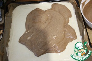Противень застилаем бумагой для выпечки. Бумагу лучше всего брать силиконизированую, так бисквит легче после выпечки от нее отойдет. Распределяем светлое тесто, а затем и очень аккуратно сверху распределяем темное тесто.