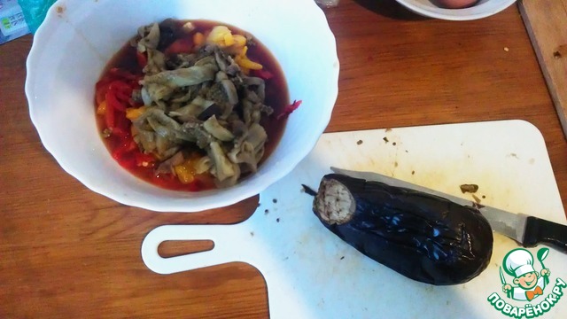 Перцы и баклажаны запечь целыми в духовке при 210 градусах (до черноты). Овощи лучше проткнуть ножом, чтобы в духовке они не взорвались.