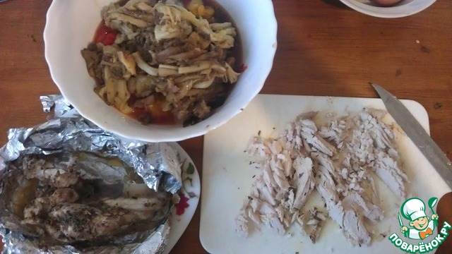 Куриную грудку запечь в духовке или отварите и разберите на волокна.