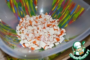 2. Нарежьте крабовые палочки средними кусочками, чтобы не получилось слишком мелко, как каша. Поместите в миску.