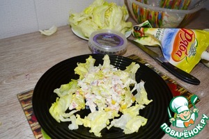 3. Затем нарежьте листья салата, так же средними ломтиками и добавьте к крабовым палочкам.