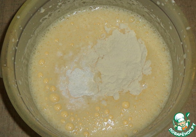Насыпать разрыхлитель и пшеничную муку, перемешать до однородности.