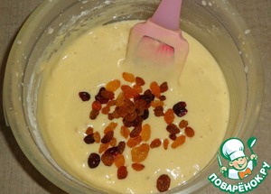 Добавить в основную массу изюм и вяленую клюкву, перемешать.