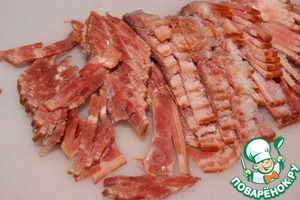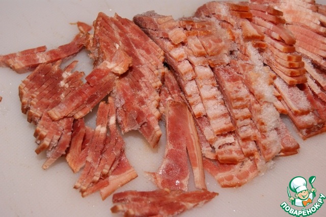 Грудинку (я предварительно подмораживаю, чтобы она резалась тонкими полосками) нарезать. -
