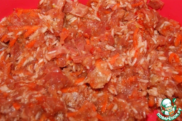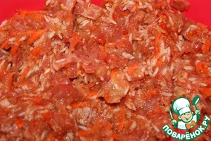 Смешать вместе свиной фарш, грудинку, натертый на крупную терку лук, рис (я не запаривала), чеснок и натертый помидор. Посолить и поперчить, учитывая соленость грудинки.