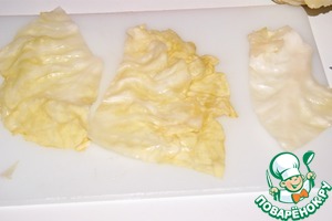 Разобрать кочан на листья, срезая утолщения и разрезая их пополам или на три части, если листья крупные. Я срезаю под углом, в результате получаются треугольники, которые очень удобно заворачивать.