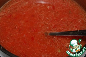 Перец, лук и помидор пробить в блендере до состояния пюре. Добавить в кастрюлькуу с горячим бульоном, посолить и поперчить, добавить масло и хорошо размешать. Варить не нужно. -