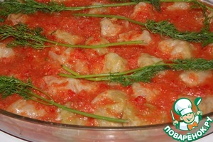Влить соус поверх голубцов. Сверху разместить укроп.