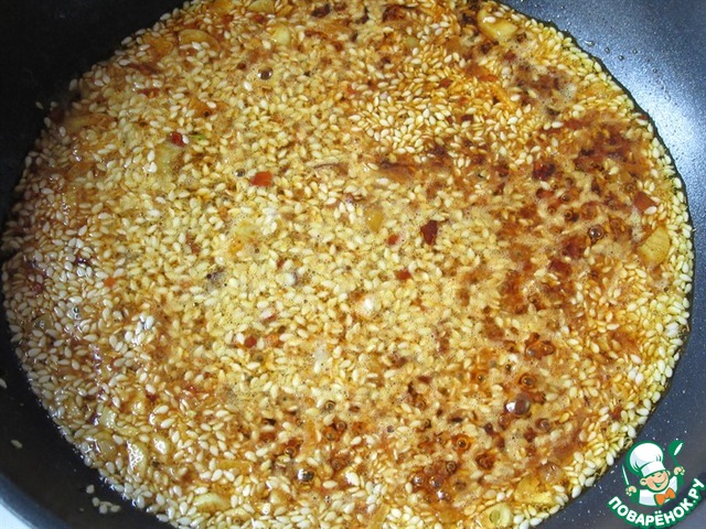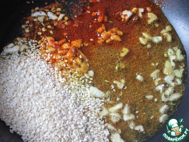 Для заправки разогреть растительное масло (в идеале оливковое), добавить мелко нарезанный чеснок, обжарить 30 секунд, добавить пряности и кунжут, обжарить еще 30 секунд.