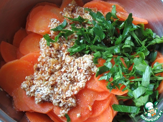 К моркови добавить заправку и рубленную петрушку, посолить по вкусу, перемешать.