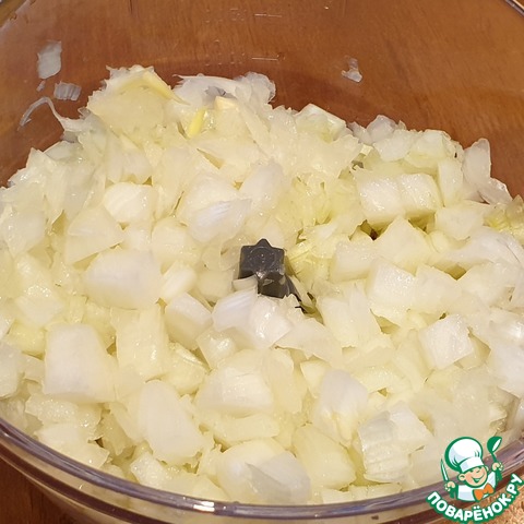 Нарезать лук кубиком при помощи комбайна или вручную. Обжарить лук до прозрачности.