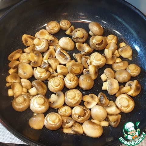 Шампиньоны обжарить на сильном огне в небольшом количестве масла со всех сторон. Крупные грибы порезать на половинки или четвертинки.