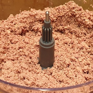 Отварное мясо нарезать кусочками и сложить в чашу комбайна. Можно добавить пару столовых ложек бульона.
