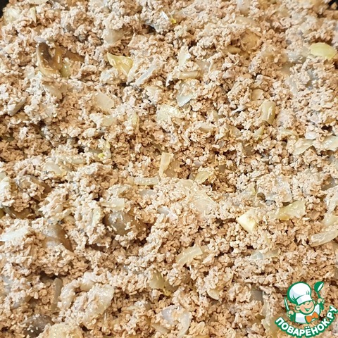 Выложить измельчённое мясо в сковороду к обжаренному луку, добавить обжаренные шампиньоны, перемешать и тушить всё вместе под крышкой на небольшом огне 5 минут. Дать начинке полностью остыть.