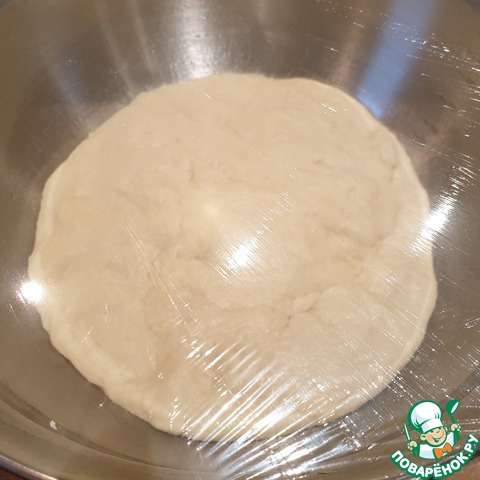 Вымесить тесто. Оно будет немного липнуть к рукам, но муку по возможности лучше не добавлять. Смазать растительным маслом подходящую миску, выложить тесто и затянуть миску пищевой плёнкой. Поставить в тёплое место для подъёма теста. Оно должно увеличиться в объёме в 2 раза минимум.