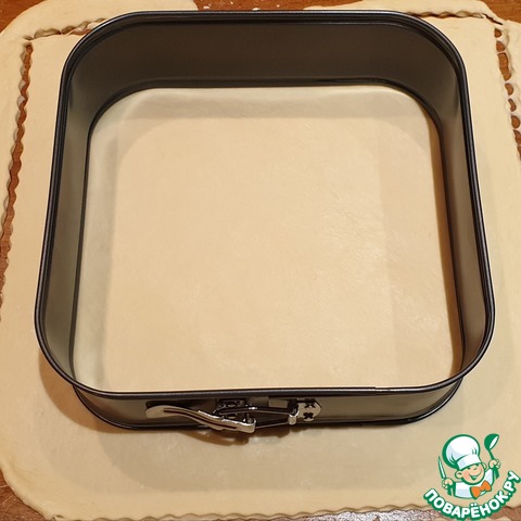 Разделить тесто на 2 части, примерно 1/3 и 2/3. Большую часть раскатать размером Вашей формы плюс бортик. У меня квадратная разъёмная форма 24×24см. Данный пирог вполне можно выпекать в круглой или прямоугольной форме большего диаметра, просто он получится чуть ниже.