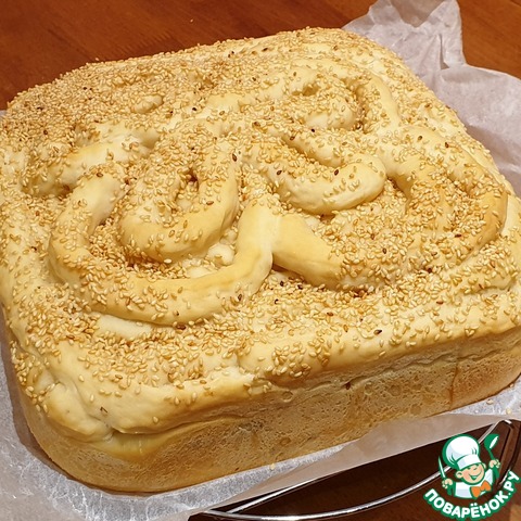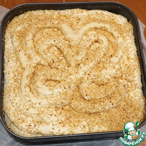 Дно формы для выпечки застелить пергаментом. Бока формы смазать растительным или сливочным маслом. Аккуратно перенести тесто, удобно это делать при помощи скалки, в форму для выпечки. Выложить на тесто начинку, разровнять. Загнуть края теста к центру, чуть защепить в уголках пирога. Затем выложить сверху оставшееся тесто. Я нарезала тесто на полоски и по кругу выкладывала получившиеся полоски от краёв к центру. Из оставшихся полосок я выложила бант. Накрыть форму полотенцем и дать пирогу подойти минут 20-30. Затем смазать верх пирога тёплой водой и посыпать при желании кунжутом.