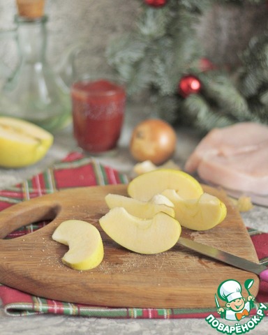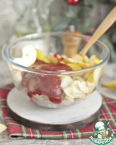 В большой миске смешиваем индейку, яблоки, лук, кетчуп.