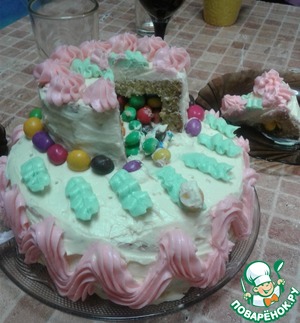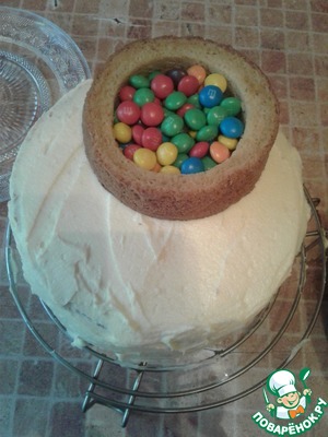В малом бисквите отрезаем верхушку шириной примерно 1,5 см. Кольцом прорезаем меньший по диаметру круг. Устанавливаем малый бисквит на большой и заполняем его любыми конфетами. Лучше взять маленькие драже, морские камешки, арахис в шоколадной или цветной глазури. -