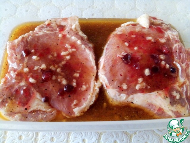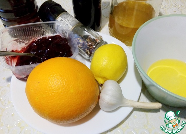Приготовить маринад. Смешать вместе апельсиновый и лимонный сок, добавить бальзамический и яблочный уксус. Затем добавить оливковое масло, соль и смесь перцев, хорошо перемешать. Добавить клюквенный джем, мед, давленый через пресс чеснок, еще раз все перемешать.