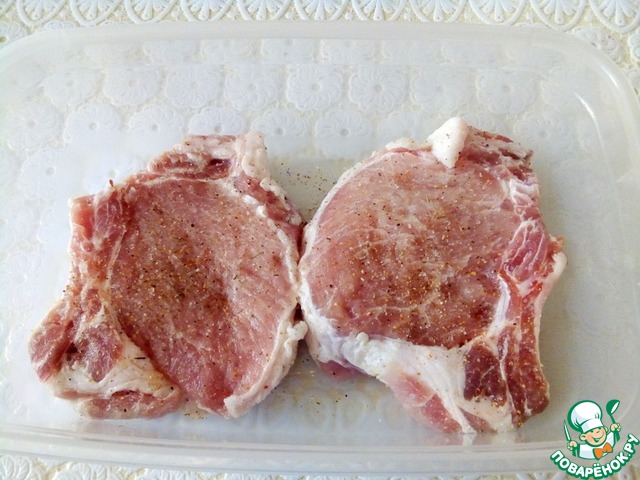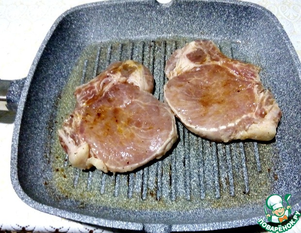Разогреть сковороду-гриль. С мяса снять маринад, чтоб не подгорал и обжарить на среднем огне с 2-х сторон до готовности, на небольшом огне.