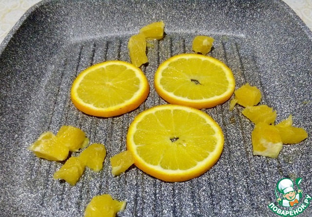 Кисточкой смазать сковороду маслом, разложить на ней кольца и кусочки апельсина, прогреть, переворачивая.