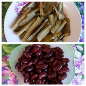 Огурцы нарезать соломкой, консервированную фасоль промыть кипяченой водой.