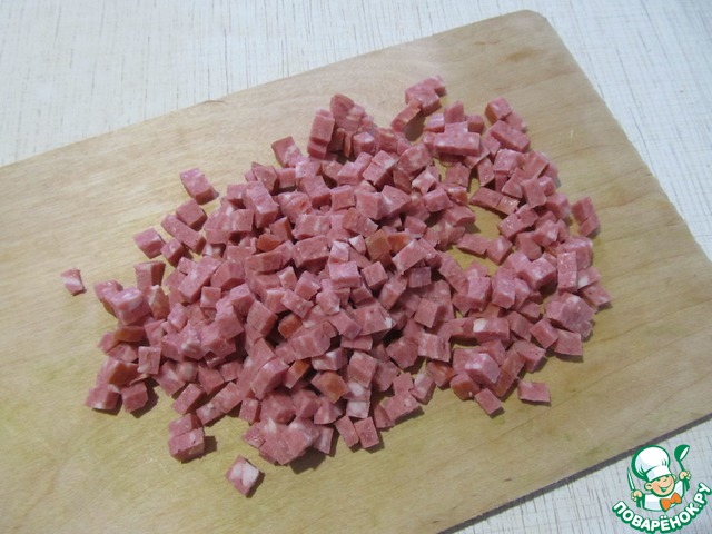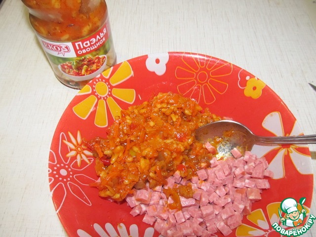 В миску выложить "Паэлью овощную", добавить колбасу.