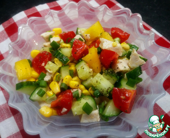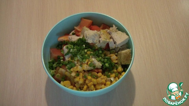 Все овощи нарезать довольно крупно. Куриное филе также крупным кубиком. Лук мелко порубить ножом. Для заправки смешать растительное масло и лимонный сок.