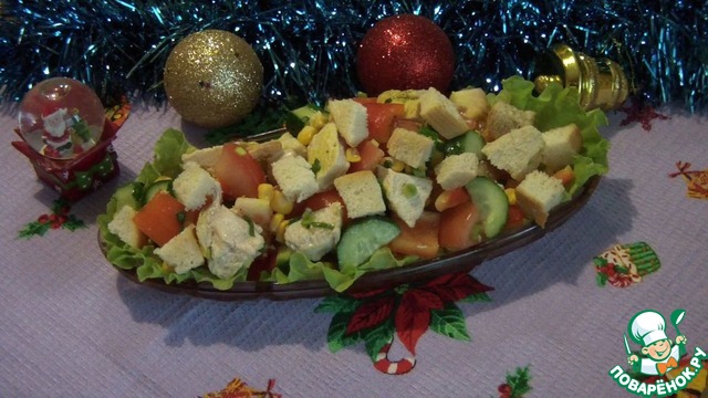 Соединить в салатнике все ингредиенты, кроме сухариков.