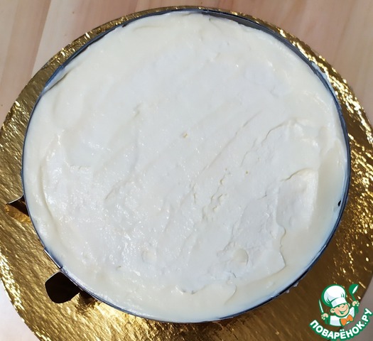 И последний слой бисквит. Убрать в холодильник на 2 часа. Затем снять с кольца.