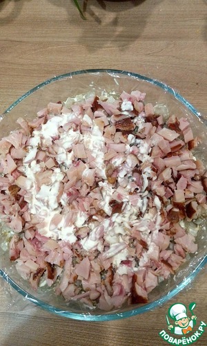 Закрываем наш салат пищевой пленкой и убираем в холодильник для пропитки и застывания желатина. Примерно на 3 часа.